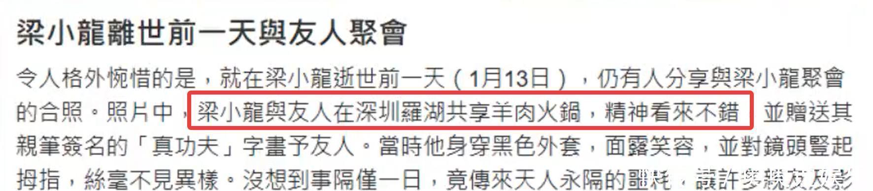 关于去世原因没人给出具体说法,目前只有圈里消息跟家人辟谣,大家随即转入低调,忙活处理后事。斯人已去,留给观众和后辈的全是江湖侠骨和银幕背后那个温和耐心、和蔼可亲的功夫老前辈。谁也没想到,和朋友的火锅小聚成了绝唱。大家都说,小时候因为“火云邪神”喜欢上搞笑,也因为梁小龙喜欢上功夫,能影响几代人的演员,真的不多见。