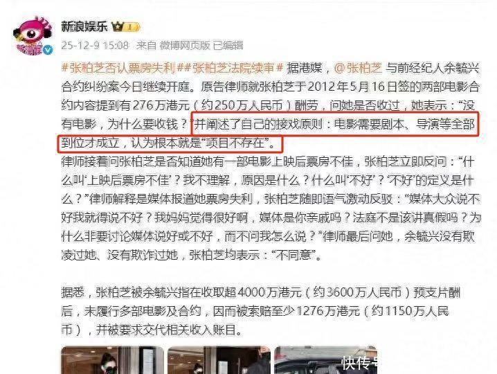 后来对方转行创业,成立了家公司,可没想到公司不仅注销了,还欠了对方六千万多,他就开始要张柏芝赔偿电影违约的钱,要求一千多万赔偿金。他说,原本打算拍四部电影,后来又加拍了两部,当时支付了她超过四千万的片酬,可结果影片都没拍完,钱也没退,还声称自己手里有她的一份独家代理合同。